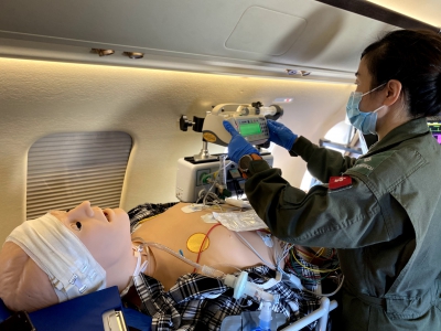圖中所見,飛行醫生及飛行護士正在練習為模擬傷者進行多項醫療程序,如輸入藥物、插入導尿管、生命表徵監測等。飛行服務隊的空勤人員亦在機艙內隨時候命,確保機上人員的安全,及協助穩固模擬傷者。